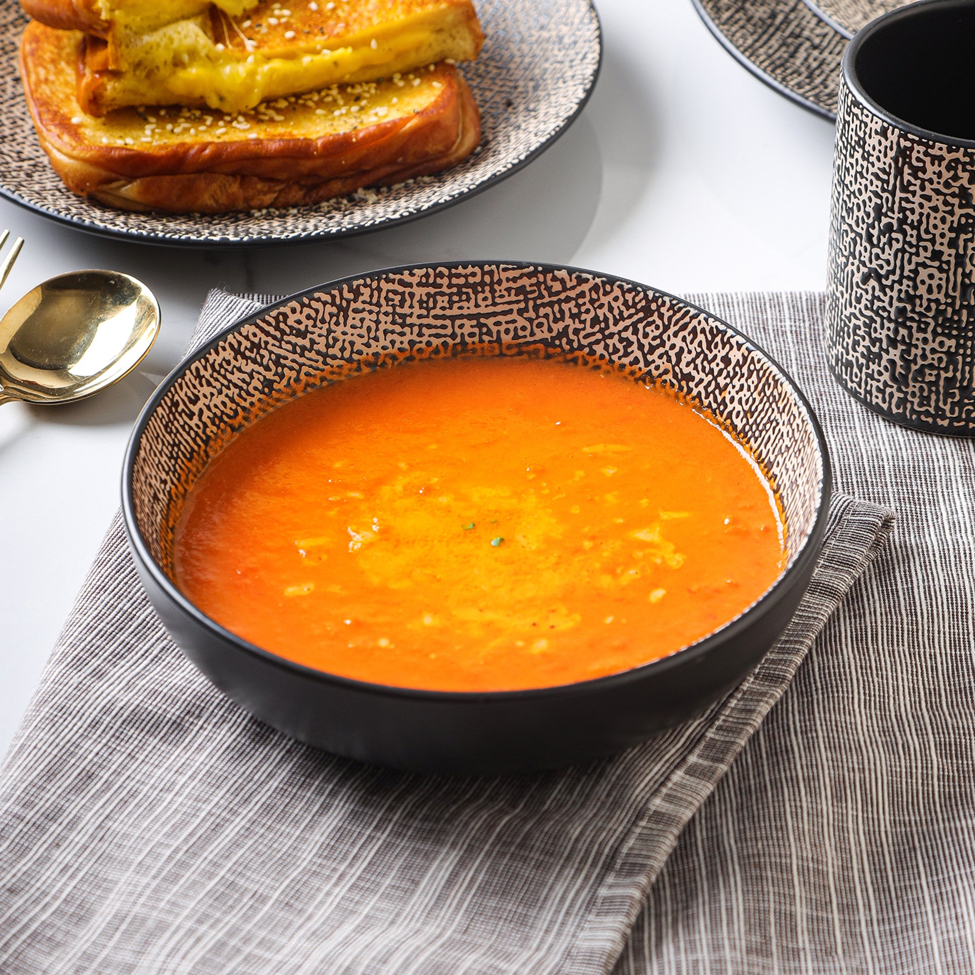 - Design: Solid matte black exterior, light neutral interior base with a black, repetitive, textured pattern. Shallow, coupe-style bowls with a simple, smooth black rim.